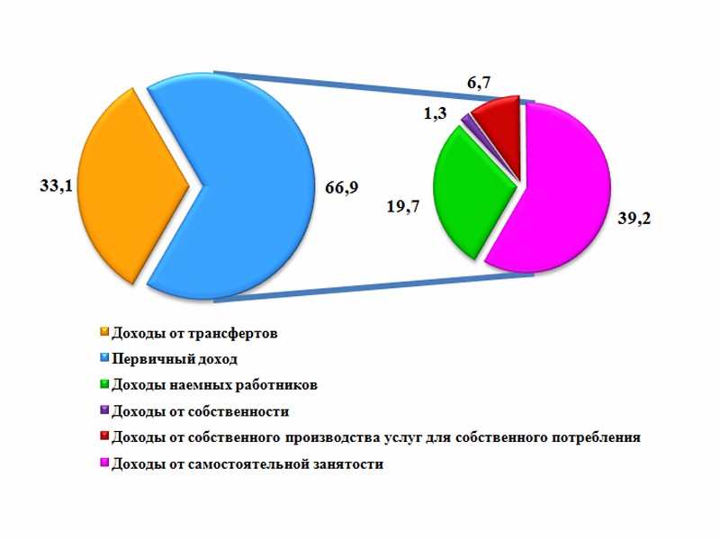 Удельный вес доходов от производства услуг для собственного потребления в общем объеме совокупного дохода населения составил 6,7 %, доходов от собственности – 1,3 % и доходов от трансфертов – 33,1 %.