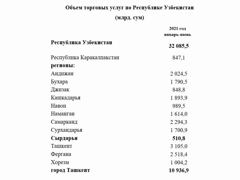 В январе - июне 2021 года в общем объеме оказанных по республике рыночных услуг на сумму 127 694,7 млрд сумов доля услуг торговли составила 32 085,5 млрд сумов, или 25,1% от общего объема рыночных услуг.