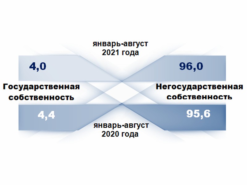 Строительные работы в целом по республике, осуществленные государственными организациями, достигли 2643,4 млрд. сум, объем строительных работ, выполненных негосударственными организациями, составил 63769,0 млрд. сум, а их доля равна 4,0 % и 96,0 % соответственно.