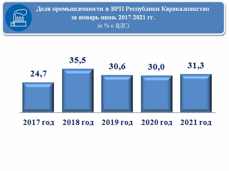 По итогам января-июня 2021 года валовая добавленная стоимость (ВДС) в промышленности по Республике Каракалпакстан составила 3 201,7 млрд.сум и, по сравнению с аналогичным периодом прошлого года, увеличилась на 7,2 %. В рассматриваемом периоде доля этого сектора в ВРП достигла 31,3 % и, по сравнению с январем-июнем 2020 года, увеличилась на 1,3 процентных пункта.