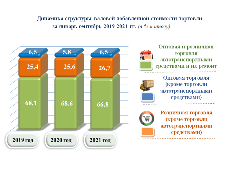 В январе-cентябре 2021 года в структуре валовой добавленной стоимости торговли наибольшая доля пришлась на розничную торговлю (кроме торговли автотранспортными средствами) и составила 66,8 % (в январе-cентябре 2020 года – 68,6 %, в январе-cентябре 2019 года – 68,1 %).