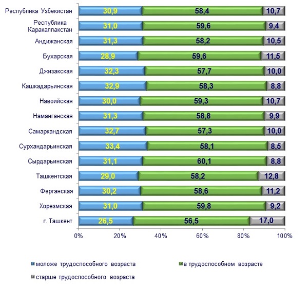 По состоянию на 1 октября 2020 года,при анализе численности населения трудоспособного возраста, доля населения трудоспособного возраста в Сырдарьинской области составляет 60,1% от общей численности населения, по численности населения в том же возрасте среди областей республики занимает первое место, а в городе Ташкент доля населения в трудоспособном возрасте составляет 56,5% от общей численности населения, и занимает последное место.