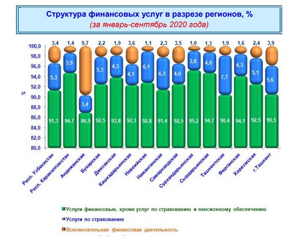 Среди регионов удельный вес финансовых услуг, кроме услуг по страхованию и пенсионному обеспечению, оказался значительным в Сурхандарьинской (95,2 %), Сырдарьинской (94,7 %) и Ферганской (94,1 %) областях.