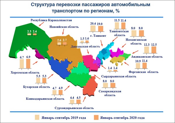 Наибольшая доля в общем объеме перевозки пассажиров автомобильным транспортом среди регионов приходится на показатели города Ташкент (19,0 %), Андижанской (12,5 %), Ташкентской (11,4 %) а также Ферганской (11,4 %) областей.