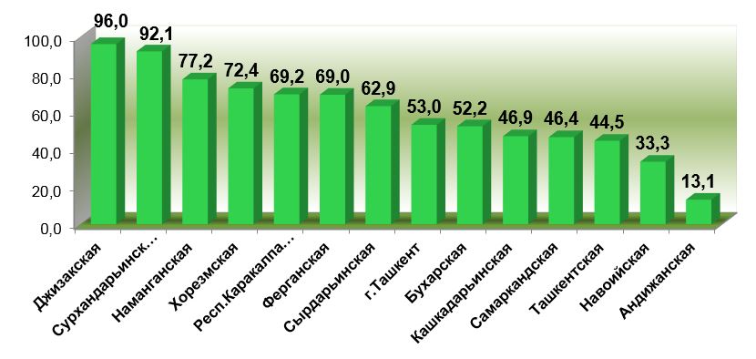 Доля импорта товаров (работ и услуг) малого бизнеса в общем объеме импорта достигла 51,4 %. По регионам наиболее высокие показатели были в Джизакской (96,0 %), Сурхандарьинской (92,1 %), Наманганской (77,2 %) и Хорезмской (72,4 %) областях.