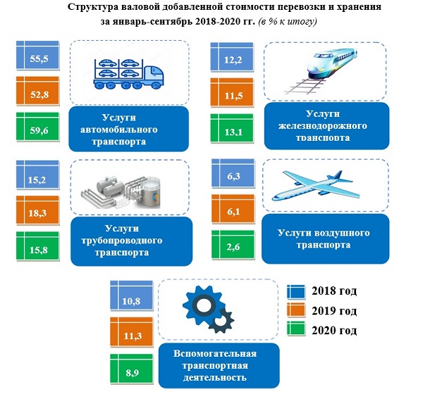 Трубопроводный транспорт составил 15,8 % (в январе-сентябре 2019 года – 18,3 %), железнодорожный транспорт – 13,1 % (в январе-сентябре 2019 года – 11,5 %), вспомогательная транспортная деятельность – 8,9 % (в январе-сентябре 2019 года – 11,3 %), воздушный транспорт – 2,6 % (в январе-сентябре 2019 года – 6,1 %) от общего объема добавленной стоимости данной отрасли.