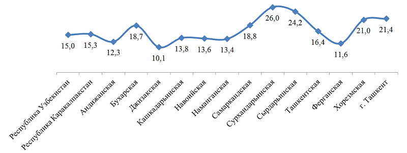 По регионам самый высокий уровень отмечен в Сурхандарьинской области - 26,0% от общего объема строительных работ по области или 974,6 млрд. сум выполненных строительных работ на строительство гражданских объектов.