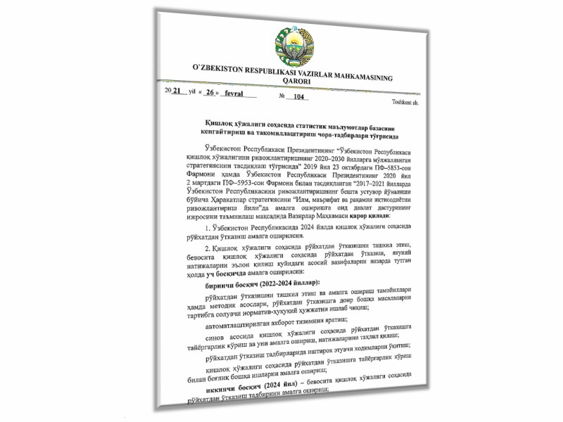 В соответствии с Постановлением Кабинета Министров Республики Узбекистан «О расширении и совершенствовании статистической информационной базы в области сельского хозяйства» от 26 февраля 2021 года №104, в 2024 году в Республике Узбекистан реализуется мероприятие по проведению переписи в сфере сельского хозяйства.
