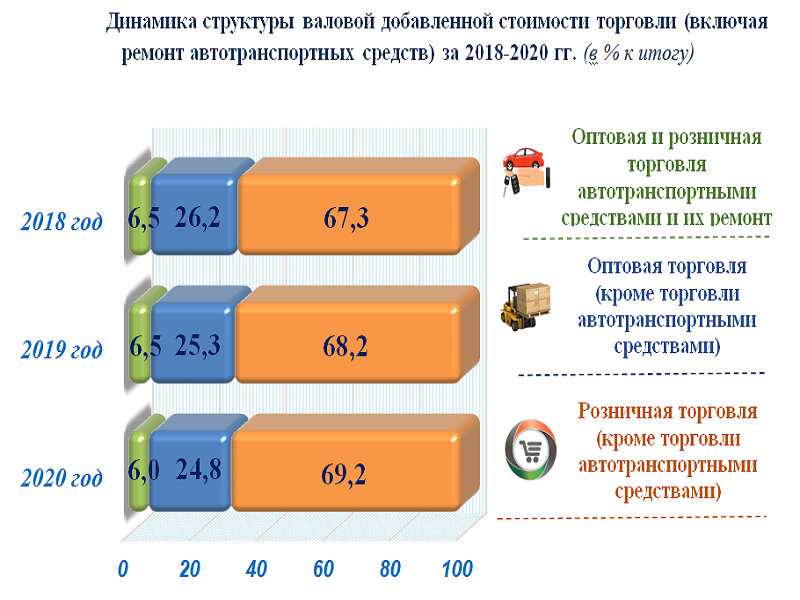В 2020 году в структуре валовой добавленной стоимости торговли (включая ремонт автотранспортных средств) наибольшая доля пришлась на розничную торговлю (кроме торговли автотранспортными средствами) и достигла 69,2 % (в 2019 году – 68,2 %, в 2018 году – 67,3 %).