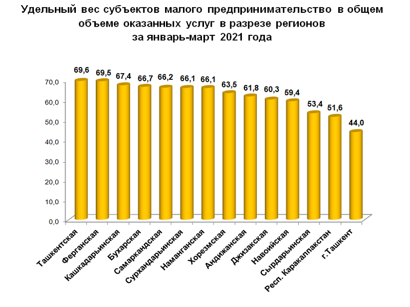 В январе-марте 2021 года удельный вес субъектов малого предпринимательства в общем объеме оказанных услуг составил 51,7 %. В региональном разрезе наибольшая доля составила в Ташкентской области 69,6 %, Ферганской - 69,5 %, Кашкадарьинской - 67,4 %, Бухарской - 66,7 % и Самаркандской -66,2 % областях.