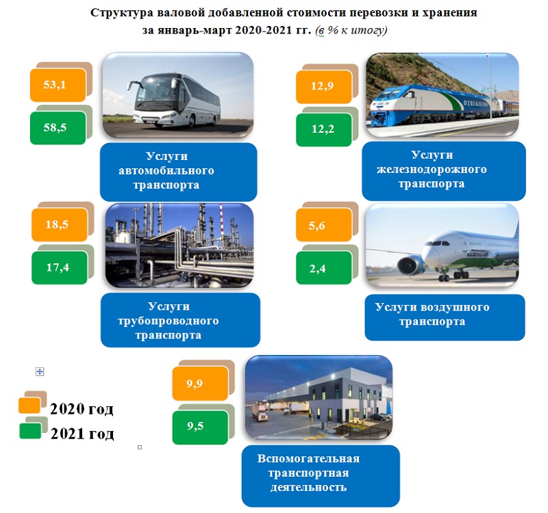 По итогам января-марта 2021 года доля перевозки и хранения в ВВП Республики Узбекистан составила 6,7 %.