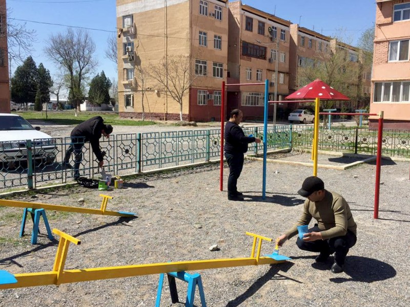 Cпортивные и игровые установки на детских площадках рядом с многоквартирными домами, расположенными на территории махалли, окрашены в разные цвета, полностью отремонтированы и сданы в эксплуатацию.