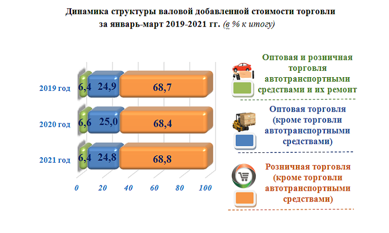 В январе-марте 2021 года в структуре валовой добавленной стоимости торговли наибольшая доля пришлась на розничную торговлю (кроме торговли автотранспортными средствами) и достигла 68,8 % (в январе-марте 2020 года – 68,4 %).