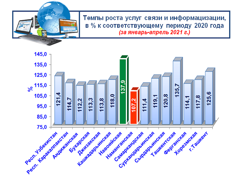 Лидерами по росту объема услуг связи и информации являются Навоийской (137,9 %) и Ташкентская (135,7 %) области, а наименьшие темпы роста зафиксированы в Наманганской (107,2 %) и Самаркандской (111,4 %) областях.