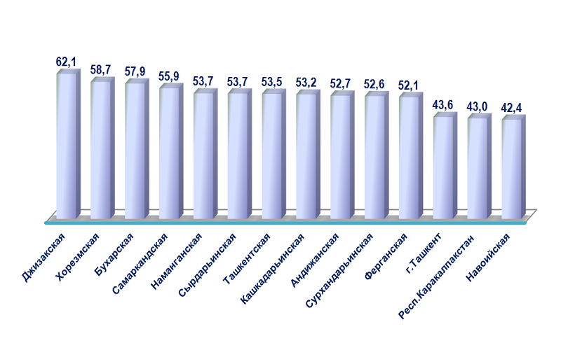 По предварительным данным за январь-март 2021 года доля доходов от малого предпринимательства в общем объеме совокупного дохода населения составила 51,6 %. По регионам наибольшая доля наблюдалась в Джизакской области (62,1 %). Самая низкая доля зафиксирована в Навоийской области (42,4 %), Республике Каракалпакстан (43,0 %), городе Ташкент (43,6 %) и Ферганской области (52,1 %).