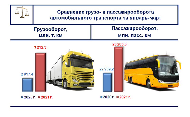 Значительную роль в перевозке грузов и пассажиров также играет автомобильный транспорт. В январе-марте 2021 года объем грузооборота увеличился на 294,9 млн. т. км. и составил 3 212,3 млн. т. км. или больше на 10,1 %, чем в аналогичном периоде 2020 года.