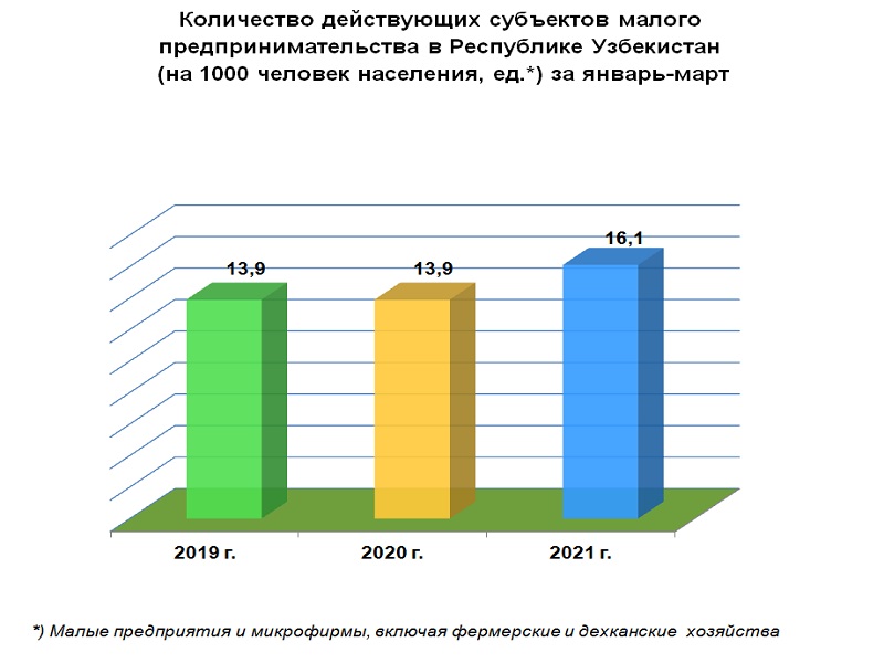В январе – марте 2021 года количество действующих субъектов предпринимательства на 1000 человек населения достигло 16,1 ед. В разрезе регионов самый высокий показатель в городе Ташкенте – 32,9 ед., Навоийской области - 21,7 ед. И Сырдарьинской области - 21,6 ед.