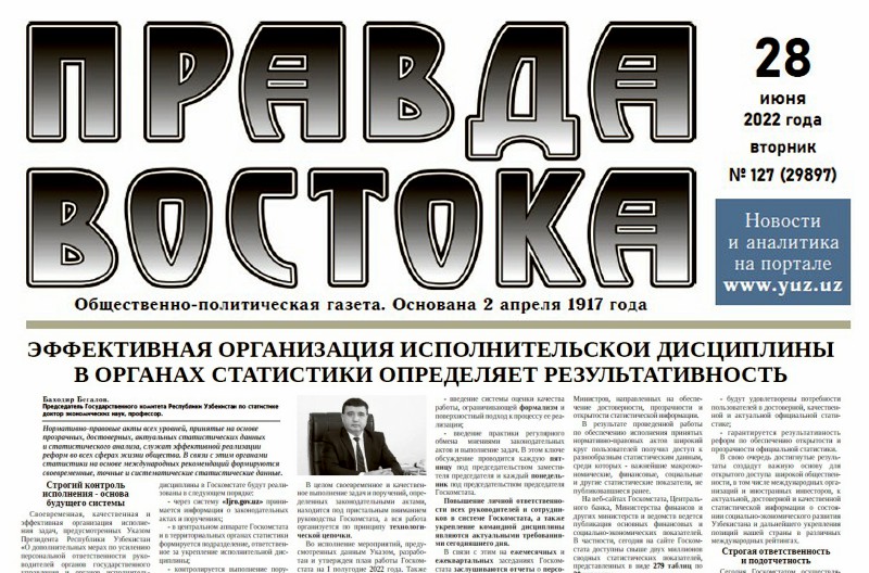 В газете «Правда Востока» №127 от 28 июня 2022 года опубликована статья Председателя Государственного комитета по статистике, доктора экономических наук, профессора Бегалова Баходира Абдусаломовича под названием «Эффективная организация исполнительской дисциплины в органах статистики определяет результативность».