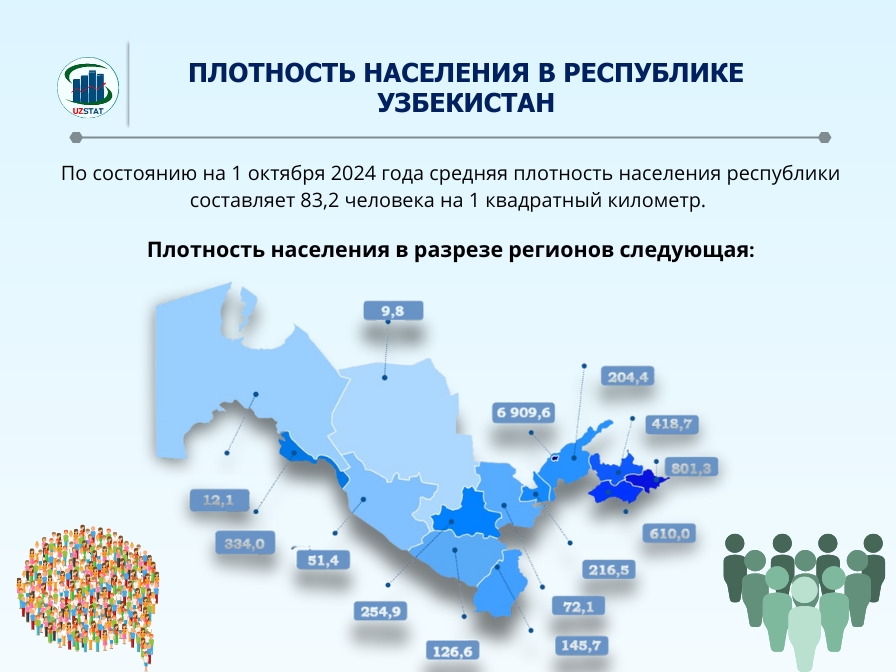 По состоянию на 1 октября 2024 года средняя плотность населения республики составляет 83,2 человека на 1 квадратный километр.