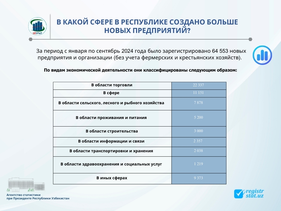 Общее количество вновь созданных предприятий в январе-сентябре 2024 года составило 64 553 ед. (без учета фермерских и дехканских хозяйств).