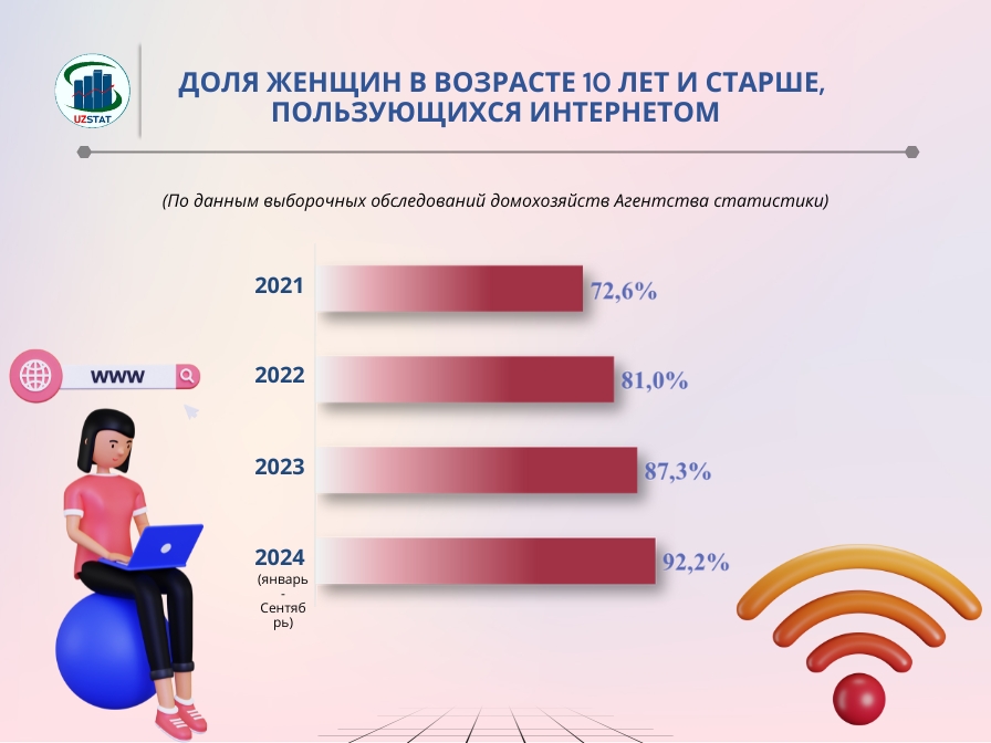 По данным выборочных обследований домохозяйств Агентства статистики, по состоянию на январь-сентябрь 2024 года, доля женщин в возрасте 10 лет и старше, пользующихся интернетом, составила 92,2 %.