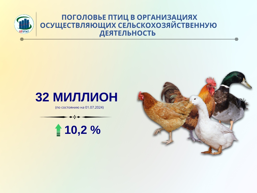 По предварительным данным, по состоянию на 1 июля 2024 года в республике количество птиц в организациях осуществляющих сельскохозяйственную деятельность достигло 32 миллионов.