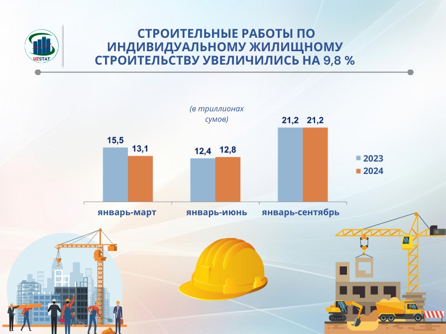 В январе-сентябре 2024 года в Республике Узбекистан по индивидуальному жилищному строительству выполнены 35,4 трлн сум строительные работы.