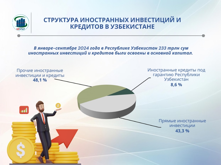 В январе-сентябре 2024 года в Республике Узбекистан 233 трлн сум иностранных инвестиций и кредитов были освоены в основной капитал.