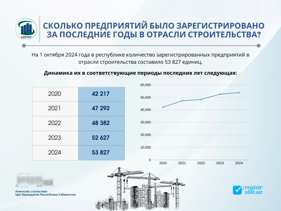 На 1 октября 2024 года в республике количество зарегистрированных предприятий в отрасли строительства составило 53 827 единиц.