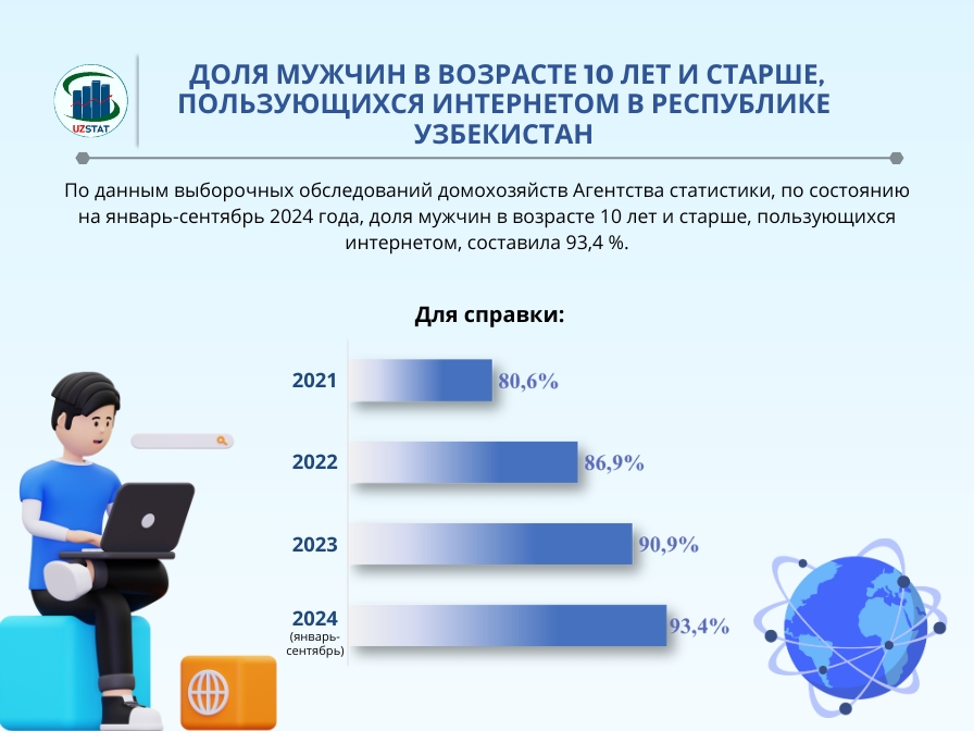 По состоянию на январь-сентябрь 2024 года, доля мужчин в возрасте 10 лет и старше, пользующихся интернетом, составила 93,4 %.