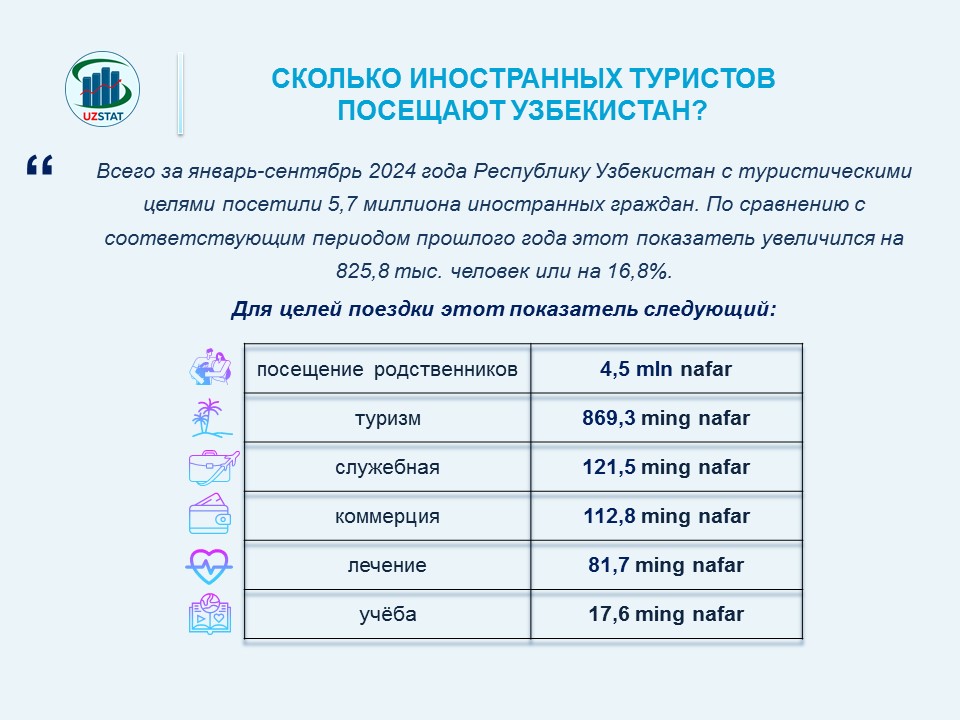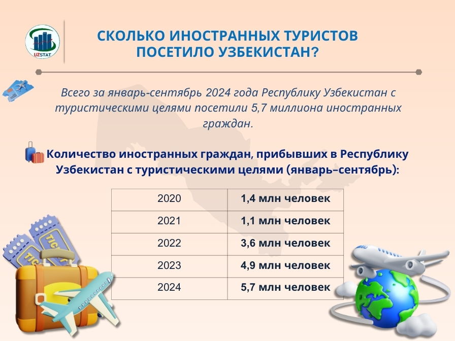 В январе-сентябре 2024 года Республику Узбекистан с туристическими целями посетили 5,7 миллиона иностранных граждан.