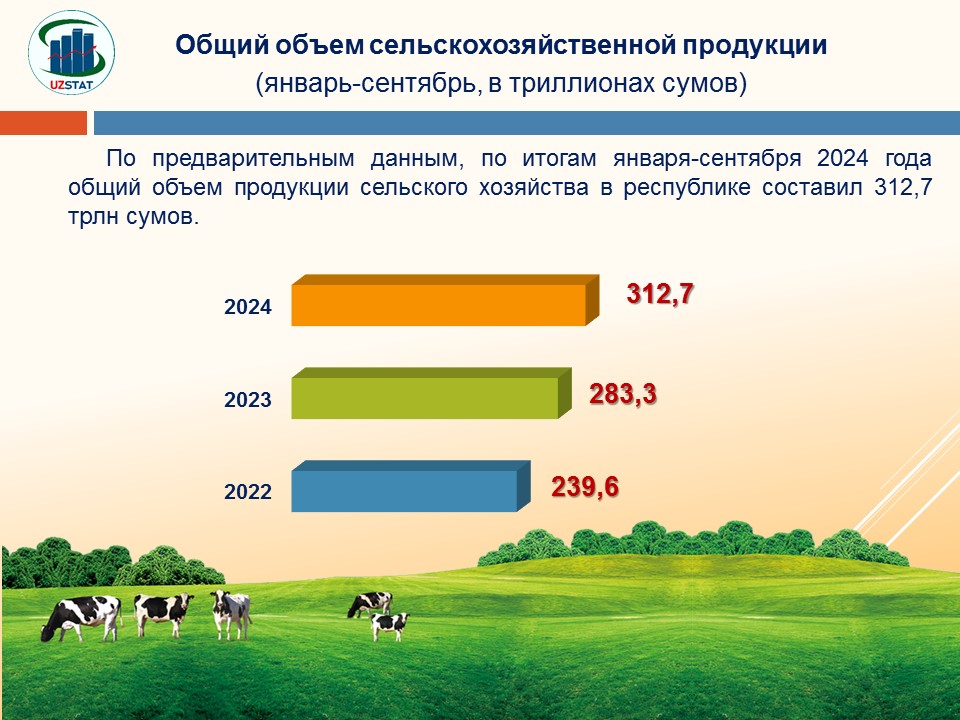 По предварительным данным, по итогам января-сентября 2024 года общий объем продукции сельского хозяйства в республике составил 312,7 трлн сумов.