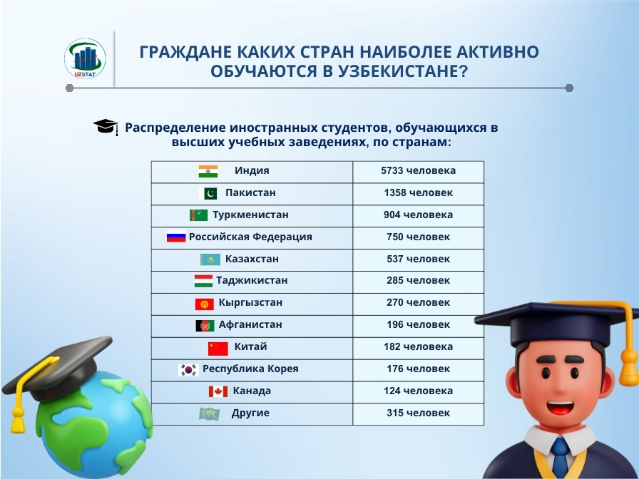 К началу 2023-2024 учебного года наибольшее количество иностранных студентов, обучающихся в высших учебных заведениях Республики Узбекистан, – из Индии, их общее количество составляет 5733 человека.