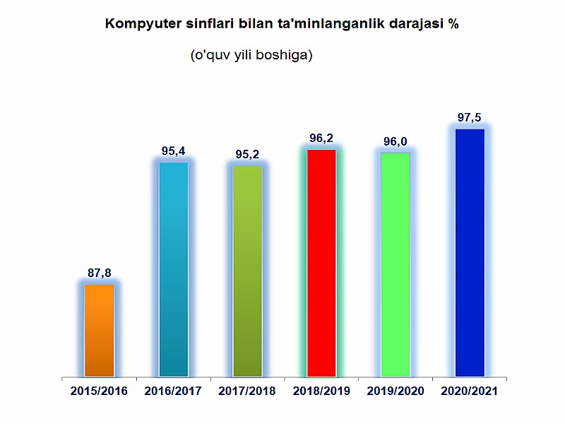 Davlat statistika qo‘mitasi ma'lumotlariga ko‘ra, 2020/2021- o‘quv yili boshiga umumta'lim muassasalari soni 10181 tani tashkil etgan bo‘lsa, ulardan kompyuter sinflariga ega bo‘lgan umumta'lim muassasalari soni 9923 tani (97,5 %) tashkil etdi.