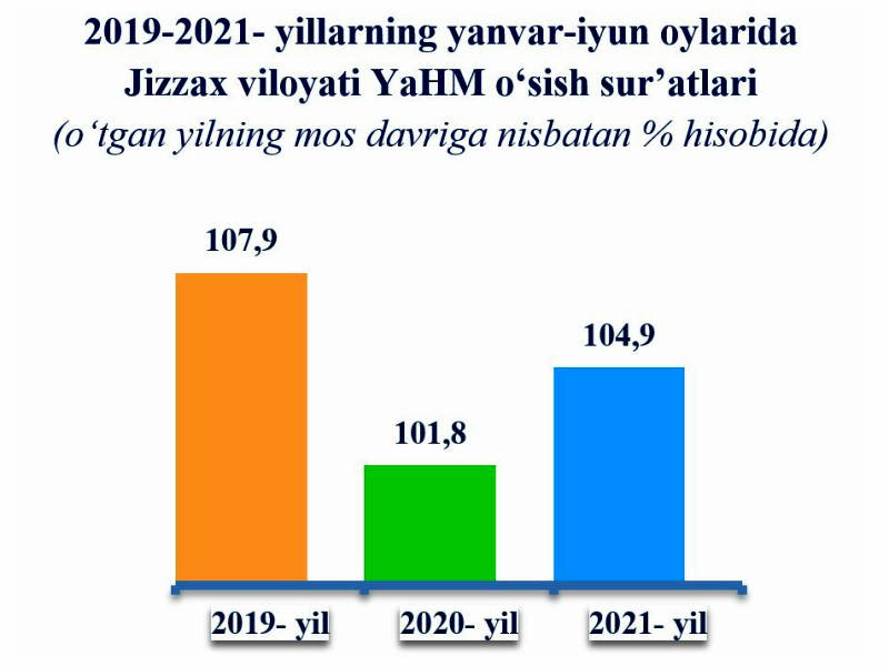 2021- yil yanvar-iyun oylari yakunlariga ko‘ra, Jizzax viloyatida YaHM hajmi 4,9 % ga o‘sdi va 8 877,2 mlrd. so‘mni tashkil etdi.