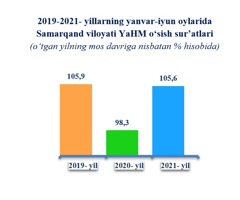 2021- yil yanvar-iyun oylari yakunlariga ko‘ra, Samarqand viloyatida YaHM hajmi 21 045,2 mlrd. so‘mni tashkil etdi va bu esa 2020- yilning yanvar-iyun ma’lumotlariga nisbatan 5,6 % ga ko‘pdir. Ushbu hududda qishloq, o‘rmon va baliqchilik xo‘jaligida 100,2 %