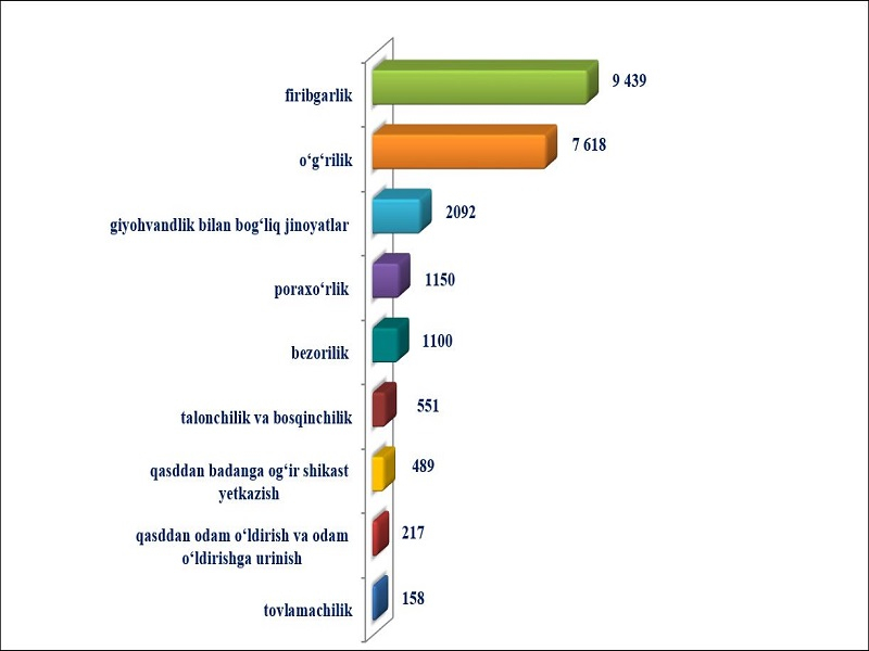 Ro‘yxatga olingan jinoyatlarning turlari bo‘yicha tahlil qilinganida, 2021- yilning yanvar-iyun oylarida respublikamizda 9439 ta firibgarlik (jamiga nisbatan 20,7 %), 8354 ta iqtisodiyot sohasida, hokimiyat, boshqaruv va jamoat birlashmalari organlarining faoliyat tartibiga qarshi jinoyatlar (jamiga nisbatan 18,3 %), 7618 ta o‘g‘rilik (16,7 %), 2500 ta o‘zlashtirish yoki rastrata yo‘li bilan talon-taroj qilish (5,5 %), 2092 ta giyohvandlik bilan bog‘liq jinoyatlar (4,6 %), 1150 ta poraxo‘rlik (2,5 %), 1100 ta bezorilik (2,4 %), 489 ta qasddan badanga og‘ir shikast yetkazish (1,1 %), 416 ta talonchilik (0,9 %), 217 ta qasddan odam o‘ldirish va odam o‘ldirishga urinish (0,5 %), 158 ta tovlamachilik (0,3 %), 146 ta nomusga tegish va nomusga tegishga urinish (0,3 %), 135 ta bosqinchilik (0,3 %) va 11816 ta boshqa turdagi jinoyatlar (25,9 %) ro‘yxatga olingan.