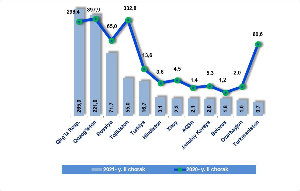 2021- yil yanvar-iyun oylarida O‘zbekiston Respublikasiga kelgan chet el fuqarolarining asosiy qismi Qirg‘iz Respublikasidan 265,9 ming kishi (barcha tashrif buyurganlarning 38,4 % i), Qozog‘iston Respublikasidan – 221,6 ming kishi (32,0 %), Rossiya Federatsiyasidan – 71,7 ming kishi (10,4 %), Tojikiston Respublikasidan – 55,0 ming kishi (8,0 %), Belarus Respublikasidan – 1,8 ming kishi (0,3 %).
