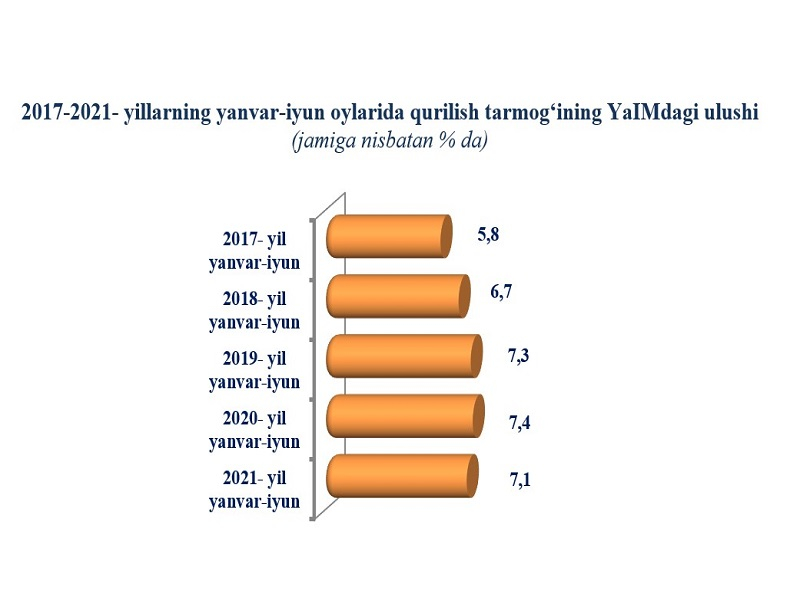 2021- yil yanvar-iyun oylari yakunlariga ko‘ra, qurilish tarmog‘ining O‘zbekiston Respublikasi YaIMdagi ulushi 7,1 % ni tashkil qildi (2020- yilning yanvar-iyunida – 7,4 %).