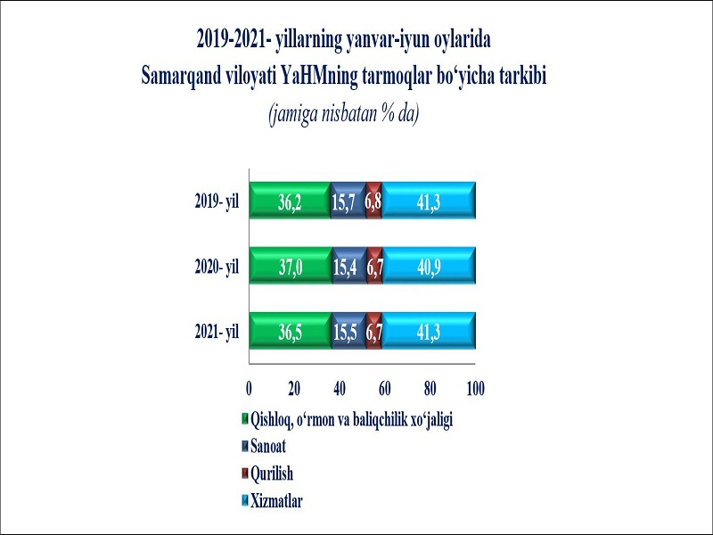 2021- yil yanvar-iyun oylari yakunlariga ko‘ra, Samarqand viloyatida qishloq, o‘rmon va baliqchilik xo‘jaligining YaHM tarkibidagi ulushi 36,5 % ni, sanoat – 15,5 % ni, qurilish – 6,7 % ni va xizmatlar sohasi – 41,3 % ni tashkil etdi.