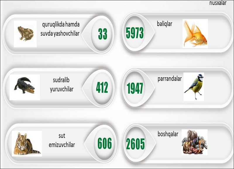 2020- yil yakuniga ko‘ra, yurtimizda 3 ta hayvonot bog‘lari mavjud. Ular Farg‘ona, Surxondaryo viloyati va Toshkent shahrida joylashgan. Bugungi kunda respublikadagi hayvonot bog‘larida jami 11576 dan ziyod hayvonot dunyosi na’munalari, jumladan 33 ta ham quruqlikda ham suvda yashovchilar, 412 ta sudralib yuruvchi, 1947 ta qush, 606 ta sut emizuvchi, 5973 ta baliq va 2605 ta boshqa turdagi hayvonot dunyosi na’munalari mavjud.