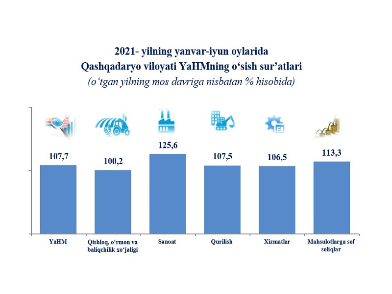2021- yil yanvar-iyun oylari yakunlariga ko‘ra, Qashqadaryo viloyatida YaHM hajmi 7,7 % ga o‘sdi. YaHM tarkibida qishloq, o‘rmon va baliqchilik xo‘jaligining o‘sish sur’atlari 100,2 % ni, sanoat – 125,6 % ni, qurilish – 107,5 % ni va xizmatlar sohasi – 106,5 % ni tashkil etdi.