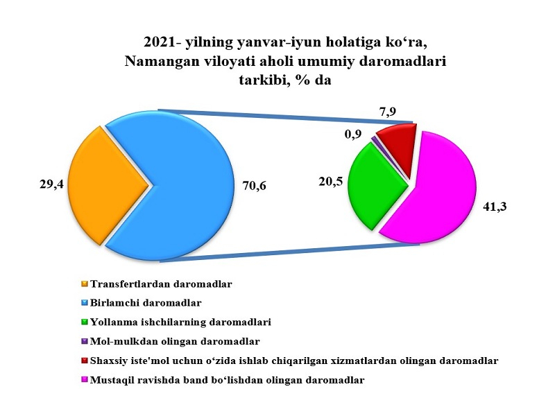 Aholi umumiy daromadlari tarkibida shaxsiy iste’mol uchun o‘zida ishlab chiqarilgan xizmatlardan olingan daromadlarning ulushi 7,9 %, mol-mulkdan olingan daromadlarning ulushi 0,9 %, transfertlardan olingan daromadlar ulushi 29,4 % ni tashkil qildi.