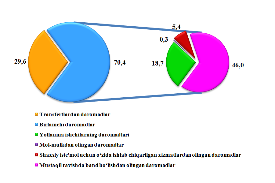 Aholi umumiy daromadlari tarkibida shaxsiy iste’mol uchun o‘zida ishlab chiqarilgan xizmatlardan olingan daromadlarning ulushi 5,4 %, mol-mulkdan olingan daromadlarning ulushi 0,3 %, transfertlardan olingan daromadlar ulushi 29,6 % ni tashkil qildi.