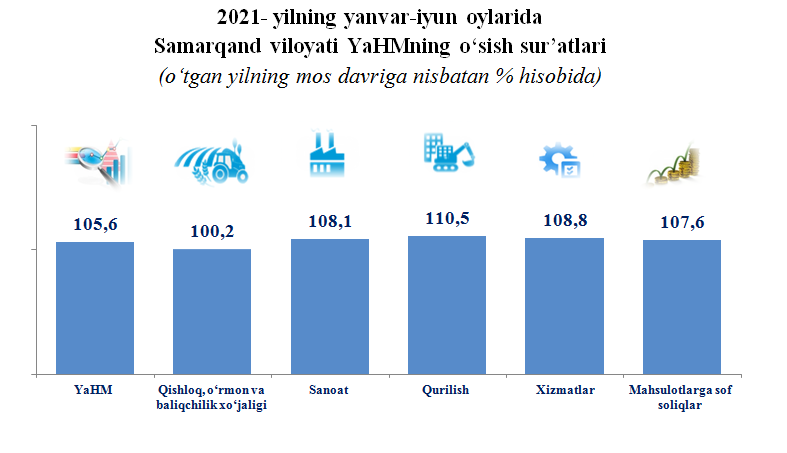 2021- yil yanvar-iyun oylari yakunlariga ko‘ra, Samarqand viloyatida YaHM hajmi 5,6 % ga o‘sdi. YaHM tarkibida qishloq, o‘rmon va baliqchilik xo‘jaligining o‘sish sur’atlari 100,2 % ni, sanoat – 108,1 % ni, qurilish –110,5 % ni va xizmatlar sohasi – 108,8 % ni tashkil etdi.