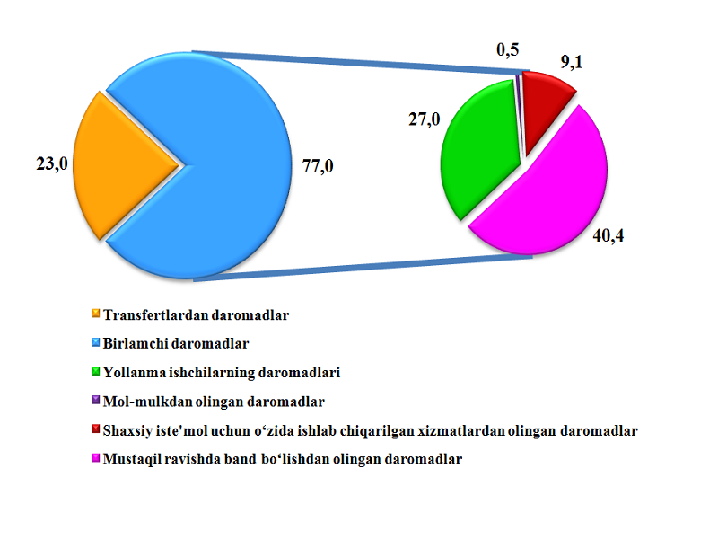 Aholi umumiy daromadlari tarkibida shaxsiy iste’mol uchun o‘zida ishlab chiqarilgan xizmatlardan olingan daromadlarning ulushi 9,1 %, mol-mulkdan olingan daromadlarning ulushi 0,5 %, transfertlardan olingan daromadlar ulushi 23,0 % ni tashkil qildi.