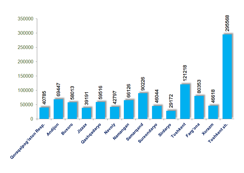 2020- yilda hududlar bo‘yicha o‘rtacha ish haqini hisoblash uchun qabul qilinadigan mehnat daftarchalariga ega bo‘lgan xodimlar soni, kishi