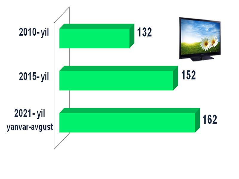 Davlat statistika qo‘mitasining ma’lumotlariga ko‘ra, 2021- yilning yanvar-avgust oylarida, uy xo‘jaliklari tanlama kuzatuvlari ma’lumotlariga asosan 100 ta uy xo‘jaligiga to‘g‘ri keladigan televizorlar soni 162 tani tashkil etdi.