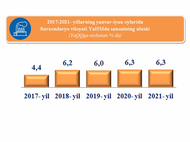 2021- yilning yanvar-iyun oylari yakunlariga ko‘ra, Surxondaryo viloyati bo‘yicha sanoatda yaratilgan yalpi qo‘shilgan qiymat (YaQQ) hajmi 837,0 mlrd. so‘mni tashkil etdi va o‘tgan yilning mos davri bilan taqqoslaganda 5,6 % ga o‘sdi. Kuzatilayotgan davrda YaHM (YaQQ) tarkibida mazkur tarmoqning ulushi 6,3 % ni tashkil etdi. 2017- yilning yanvar-iyuni bilan solishtirganda 1,9 foiz punktga oshdi.