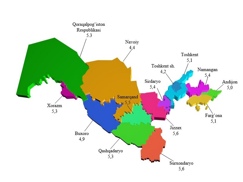 Davlat statistika qo‘mitasining uy xo‘jaliklari tanlanma kuzatuvlari 2021 yilning yanvar-sentabr holati ma’lumotlariga ko‘ra, uy xo‘jaligi a’zolarining o‘rtacha soni 5,1 kishini tashkil etdi. Hududlar bo‘yicha tahlil qilganda, eng yuqori ko‘rsatkich Jizzax va Surxondaryo viloyatlarida (5,6 kishi), eng quyi ko‘rsatkich esa Toshkent shahrida (4,2 kishi) qayd etilganini ma’lum qilinadi.